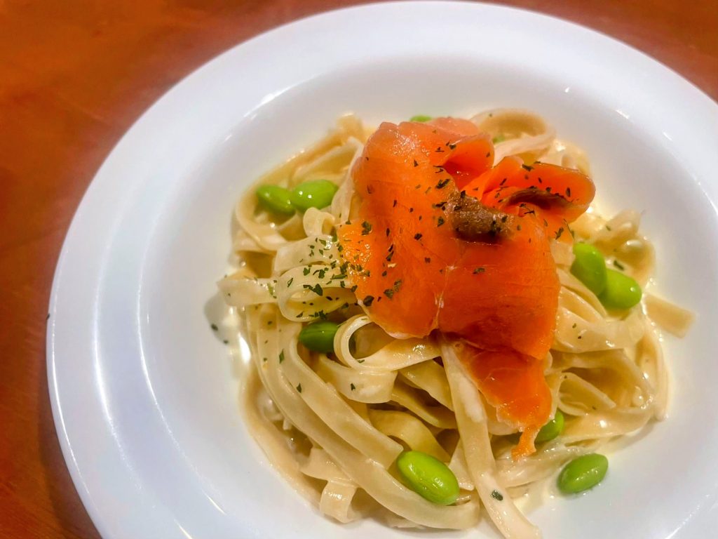E 糖質80%off‼︎大豆のロカボフェットチーネ‼︎スモークサーモンと枝豆の檸檬クリームソース