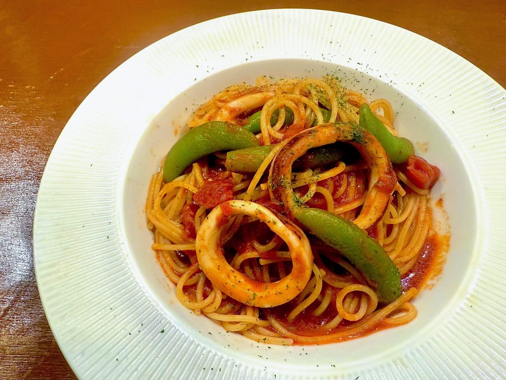 A スルメイカとスナップえんどうのトマトソースパスタ
