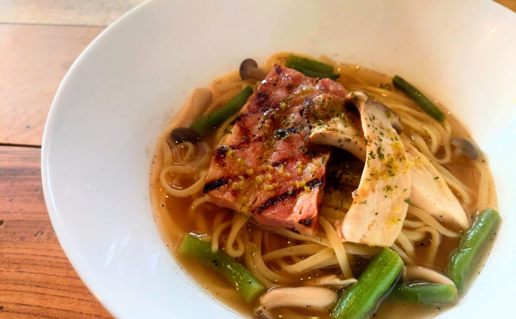 大好評のスープパスタ!!木の子とベーコンの旨味がスープにたっぷり♪柚子胡椒でさっぱり仕上げました!この機会に是非お召し上がりください!